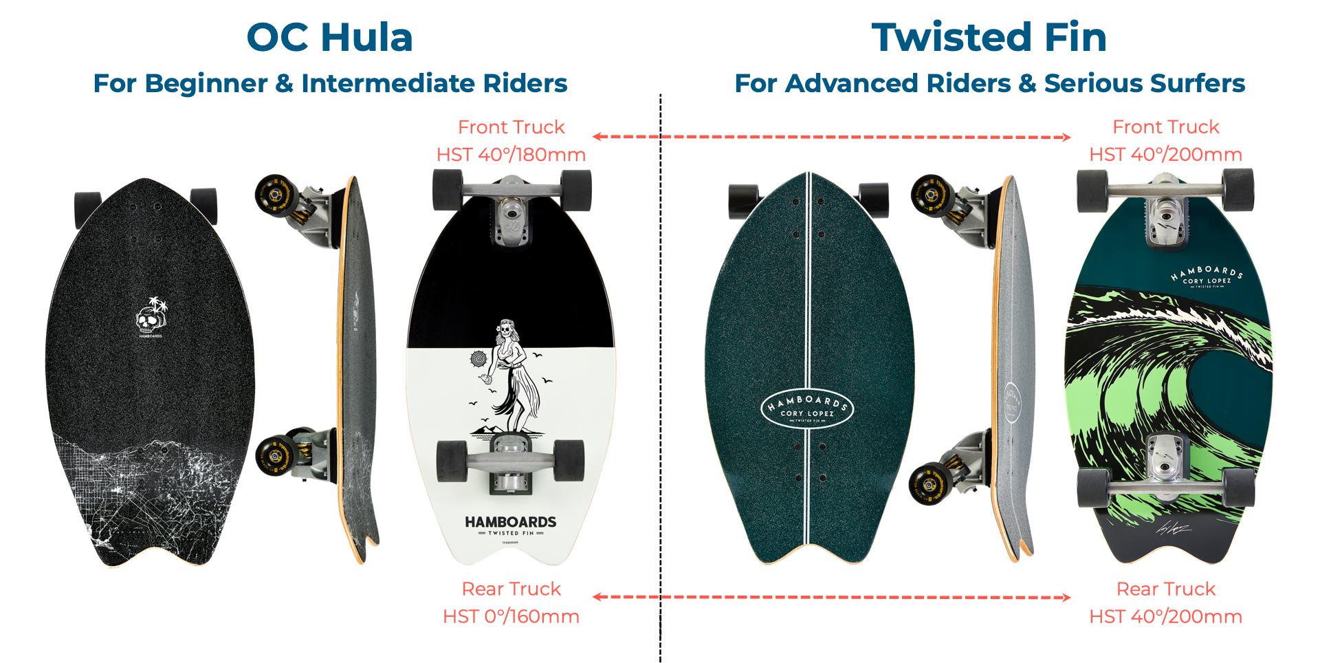 Hamboards produces trucks with four different pivot angles, 55°, 40°, 20° and 0°. After years of testing and customer feedback, we have identified three setups which cover the majority of skill levels and customer riding styles.