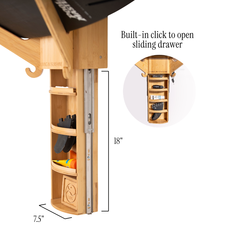 Built-in drawer shelf keeps fins, wax, and essentials organized and within reach